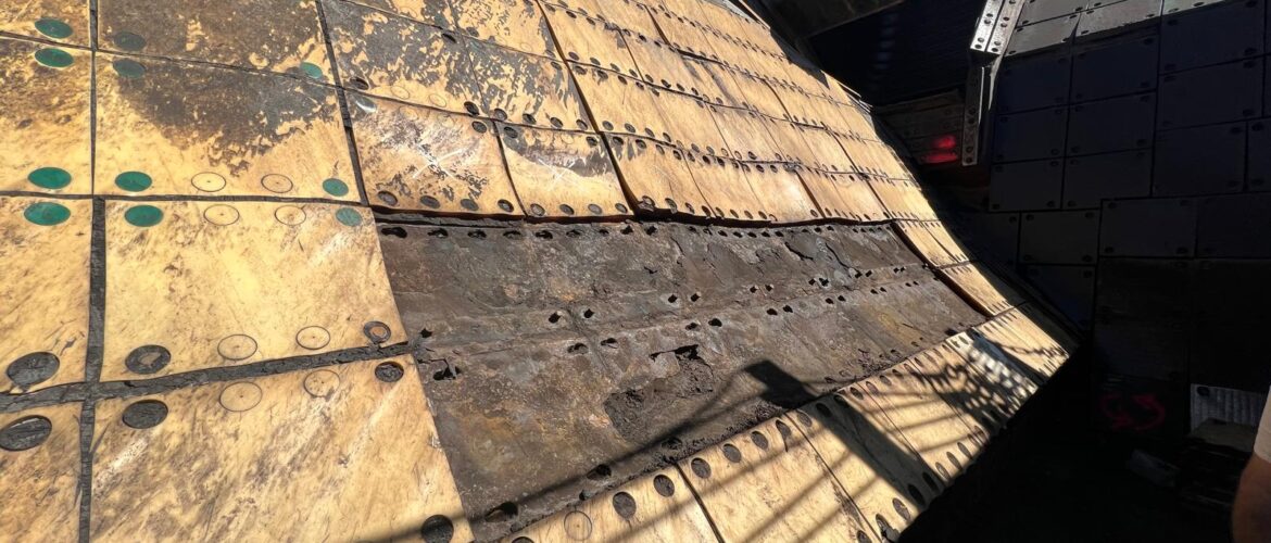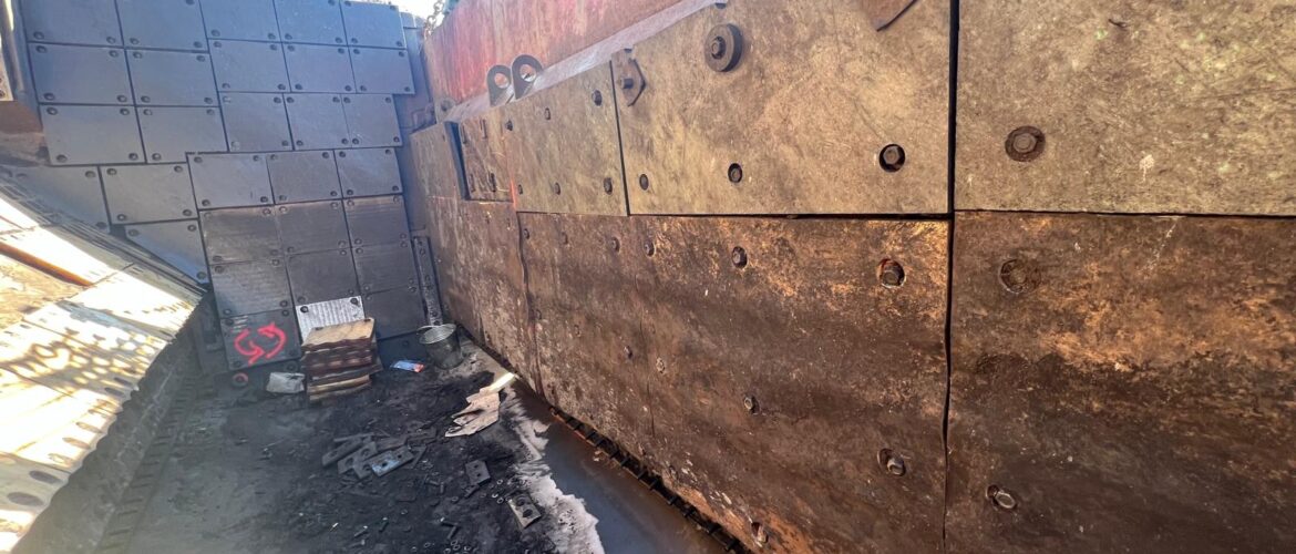 Replacement of wear protection liners on a bucket wheel excavator.
